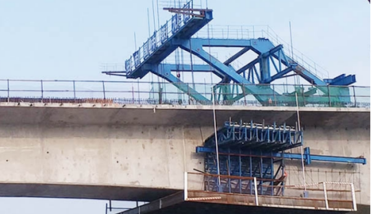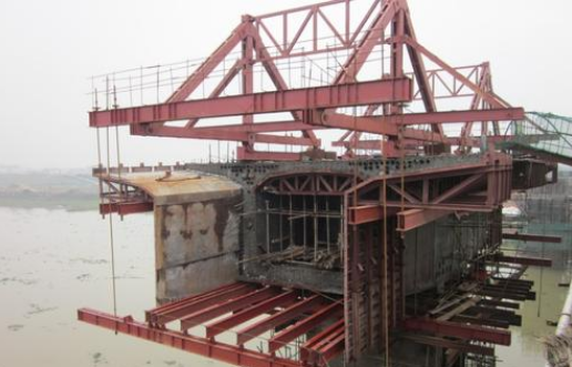 掛籃是滑動或滾動的承重構(gòu)架錨固在橋梁上,含有行走軌道。在掛籃上可進行模板、鋼筋、預應力管道的施工,混凝土灌注和預應力張拉,壓漿等作業(yè)。完成一個節(jié)段的循環(huán)后,掛籃即可前移并再次固定,進行下一階段的懸澆。一直到主跨完成并且合攏;